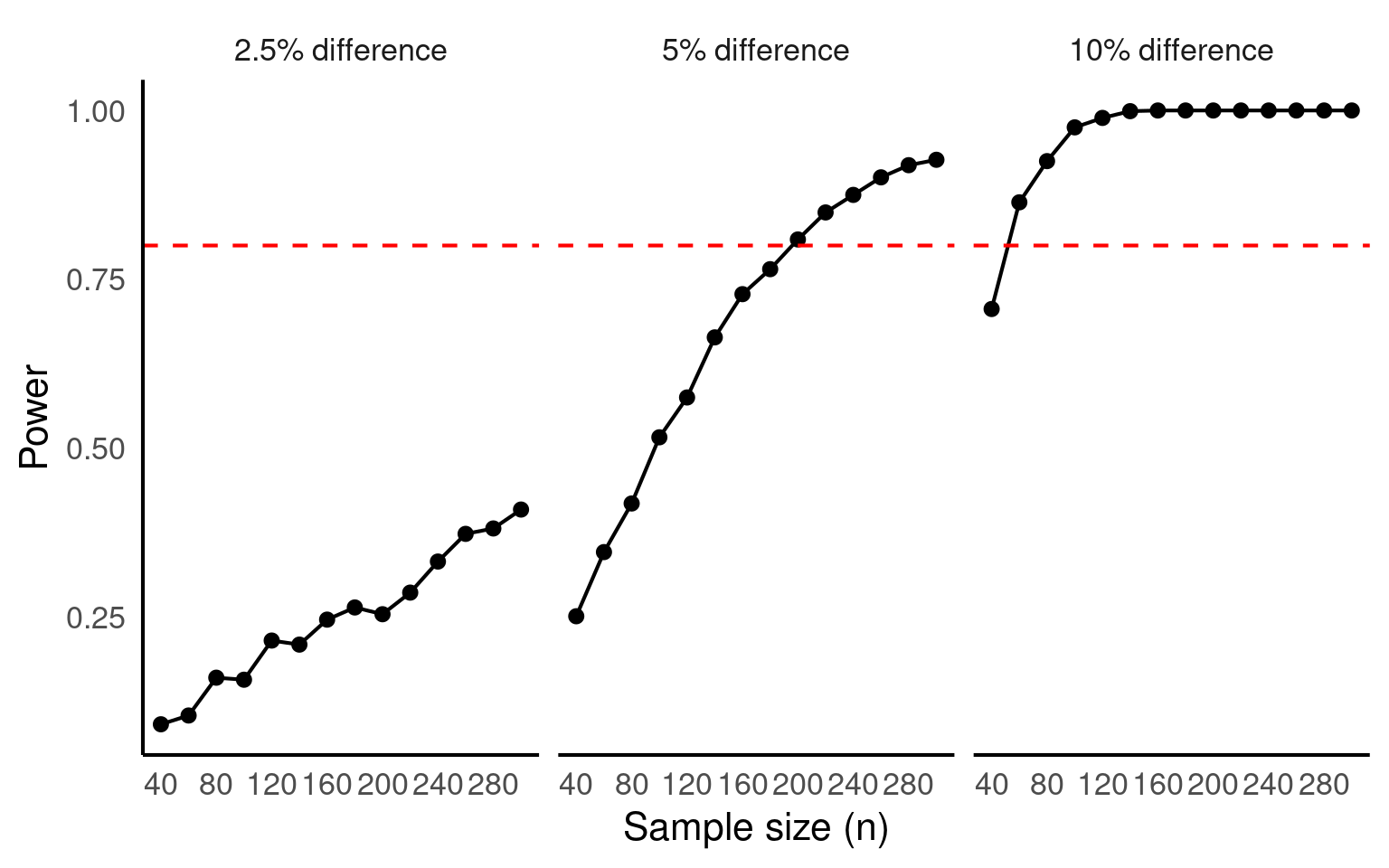 We don’t actually have sufficient power until n = 200, (100 in each group), we have an 80% chance to detect the effect